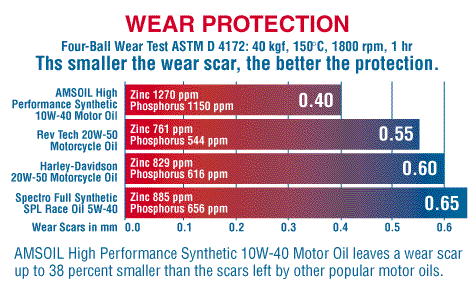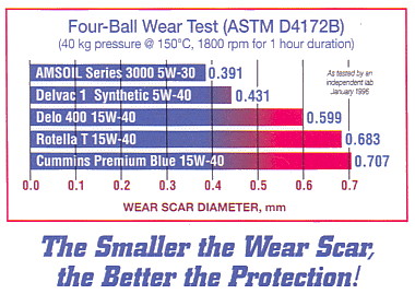 FACT: AMSOIL Synthetic Motor Oils remain fluid in cold temperatures. With AMSOIL Motor Oils engines start easier and are assured immediate start-up protection. The FOUR BALL WEAR TEST (ASTM D 4172) Compares the following 20w-50 Oils (Mobil 1 is 15w-15) as of January 1995 results TEST: 60kg, Pressure @150 Degrees C 1800 RPM for 1 hour duration